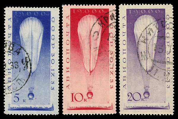 6041 O C37-C39 imageAirmail, 1933, Stratosphere Balloon Flight complete (Scott C37-C39), complete set of singles, Very Fine to Extremely Fine.