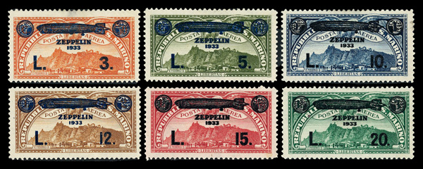 6043 og C11-C16 imageAirmail, 1933, Graf Zeppelin complete (Scott C11-C16), complete set of singles, o.g., hinged, Very Fine to Extremely Fine.