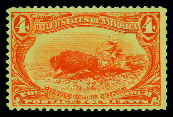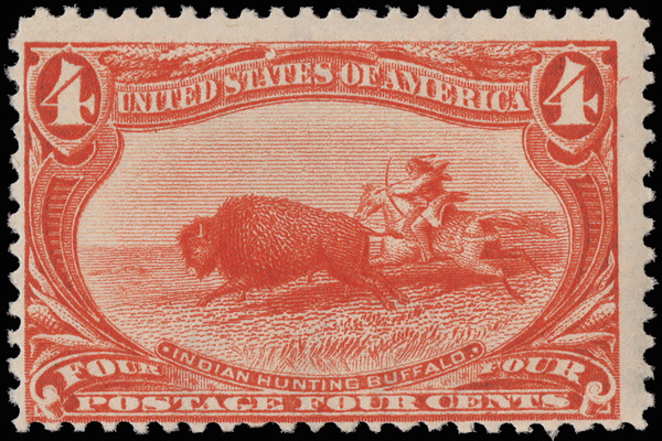 5093 nh 287 image1898, 4¢ Trans-Miss. (Scott 287), o.g., never hinged, brilliant color; perfs just touching at the bottom, about Fine.