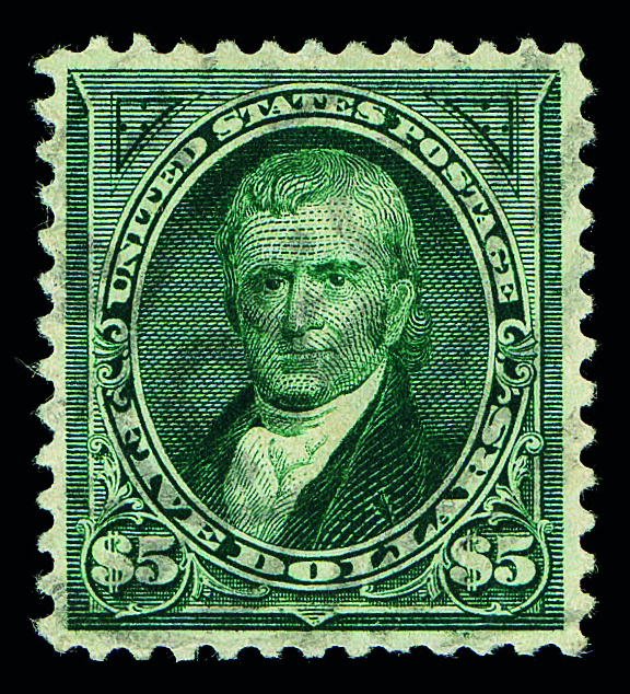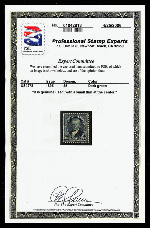 5087 O 278 image1895, $5 dark green, D.L. watermark (Scott 278); small thin, Very Fine, with 2006 P.S.E. certificate.