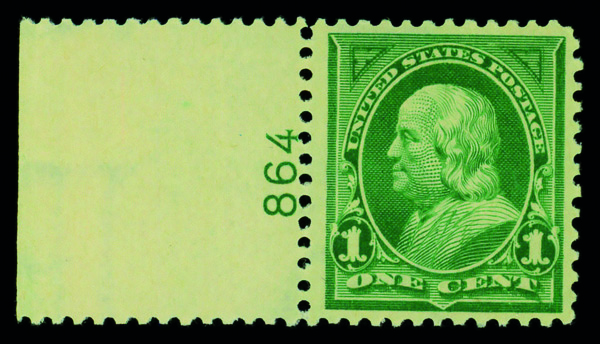 5089 nh 279 image1898, 1¢ deep green (Scott 279), plate number single, o.g., never hinged, Very Fine.