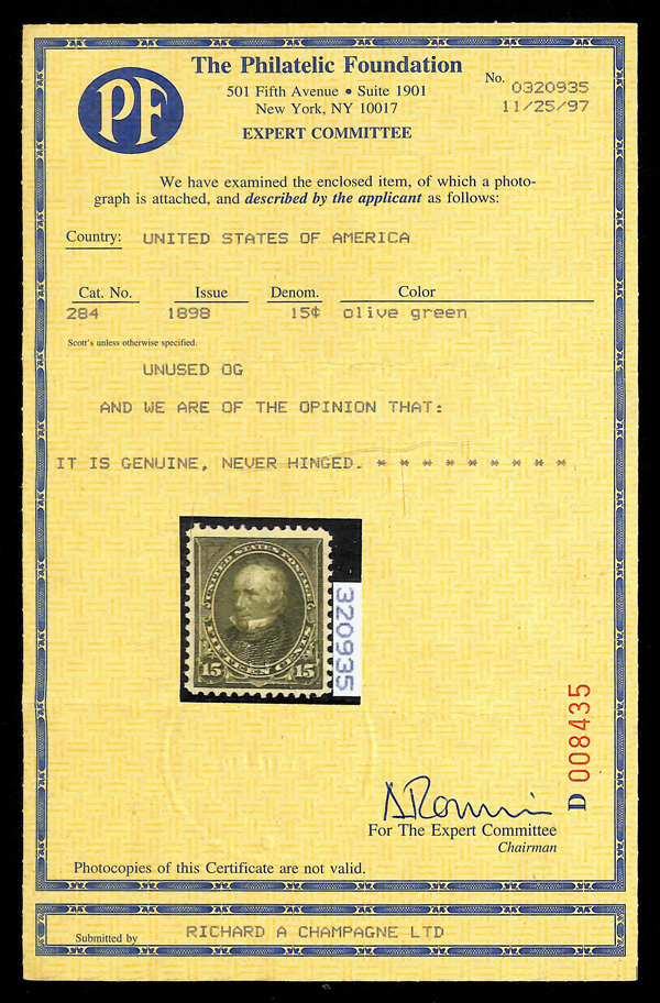 5092 nh 284 image1898, 15¢ olive green (Scott 284), o.g., never hinged, Very Fine, with 1997 P.F. certificate.