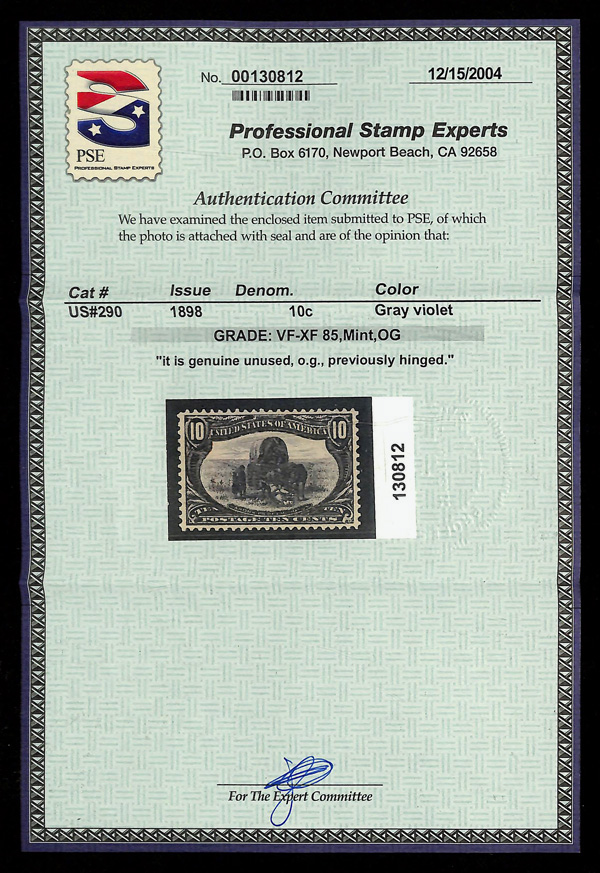 5095 og 290 image1898, 10¢ Trans-Miss. (Scott 290), o.g., very lightly hinged, Very Fine to Extremely Fine, with 2004 P.S.E. certificate graded VF-XF 85.