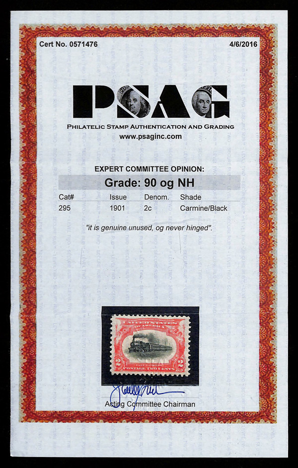 5097 nh 295 image1901, 2¢ Pan-American (Scott 295), o.g., never hinged, Extremely Fine, with 2016 P.S.A.G. certificate graded XF 90.