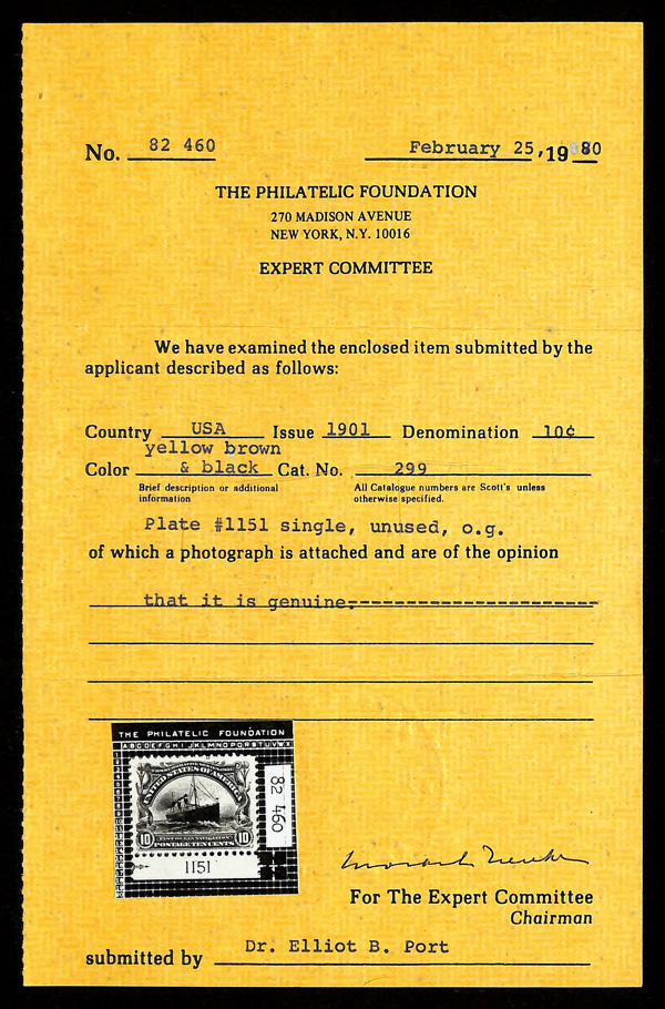 5105 og 299 image1901, 10¢ Pan-American (Scott 299), plate number single, o.g., lightly hinged, Very Fine, with 1980 P.F. certificate.