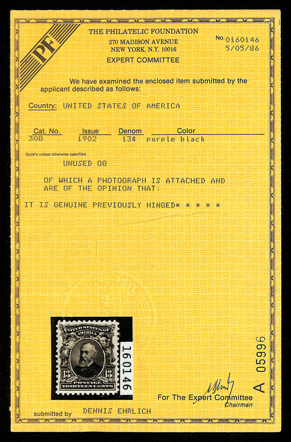 5112 og 308 image1902, 13¢ purple black (Scott 308), o.g., very lightly hinged, Very Fine, with 1986 P.F. certificate.