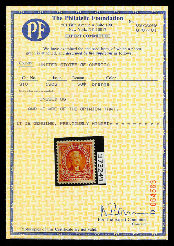 5114 og 310 image1903, 50¢ orange (Scott 310), o.g., lightly hinged, Fine to Very Fine, with 2001 P.F. certificate.