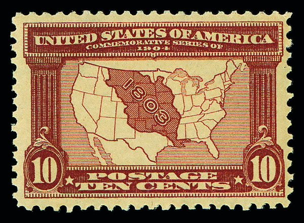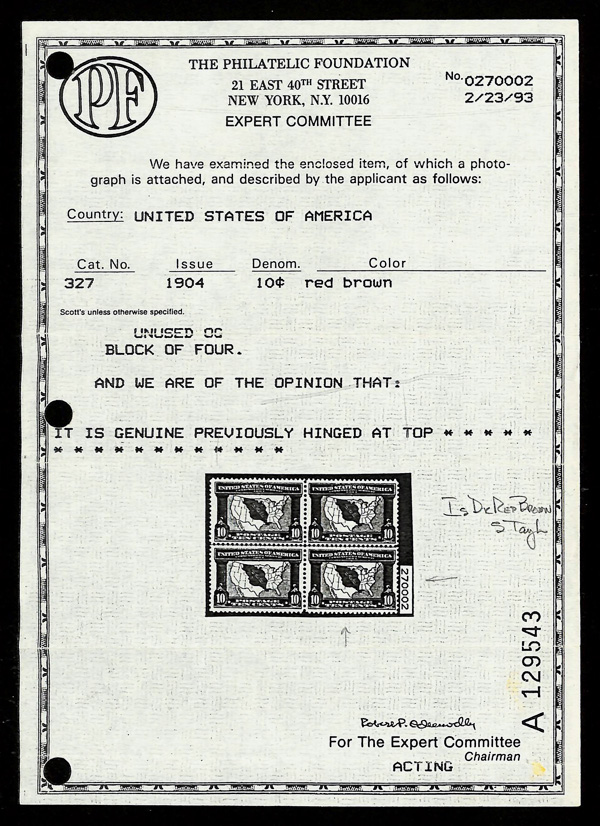 5119 nh 327 image1904, 10¢ Louisiana Purchase (Scott 327), o.g., never hinged, Fine, with photocopy of 1993 P.F. certificate for block of which this is the LR stamp.