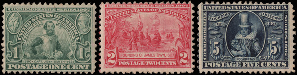 5121 ng 328-330 image1907, Jamestown complete (Scott 328-330), set of 3, regummed, Fine.