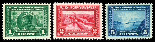 5153 nh/og 397-399 image1913, 1¢ to 5¢ Panama-Pacific, perf. 12 (Scott 397-399), Well centered with close to ideal centering, o.g., 397 never hinged / 398 and 399 are lightly hinged, Extremely Fine to Superb.