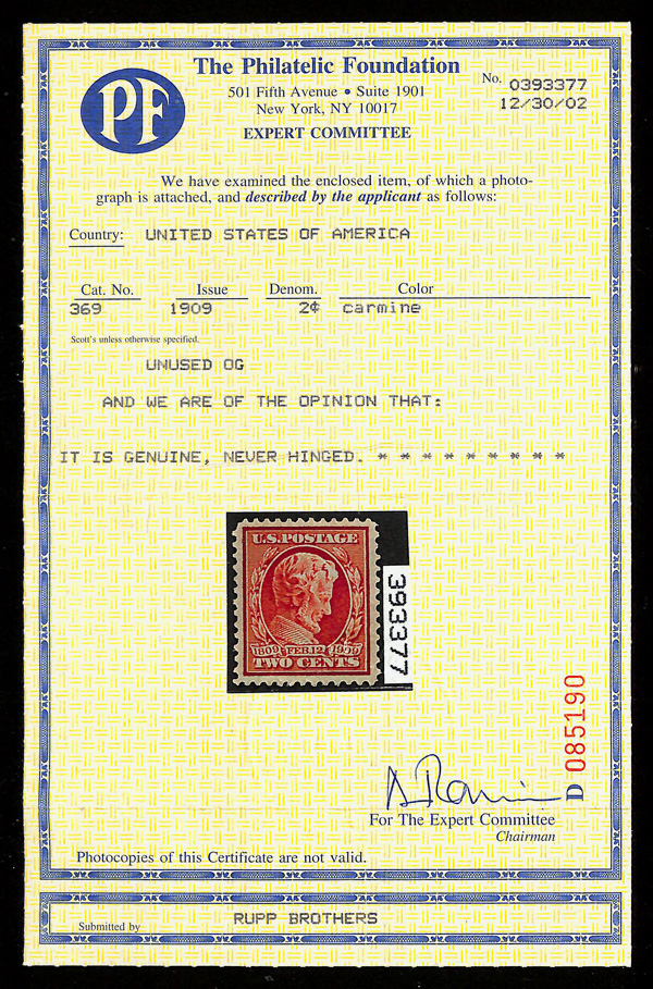 5139 nh 369 image1909, 2¢ Lincoln Centenary, bluish paper (Scott 369), o.g., never hinged, Extremely Fine, with 2016 P.S.A.G. certificate graded XF 90 & 2002 P.F. certificate.