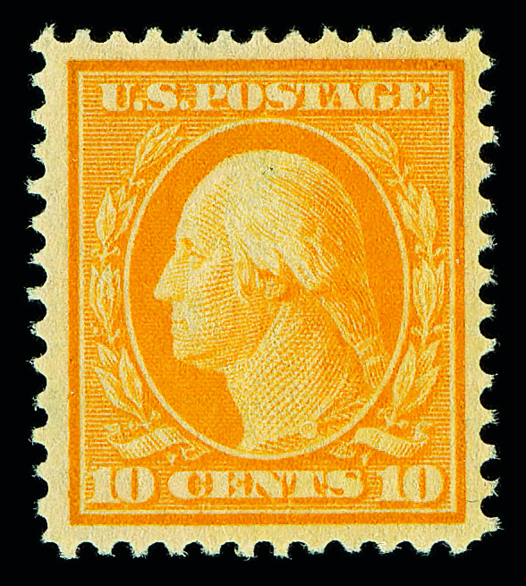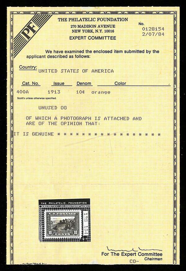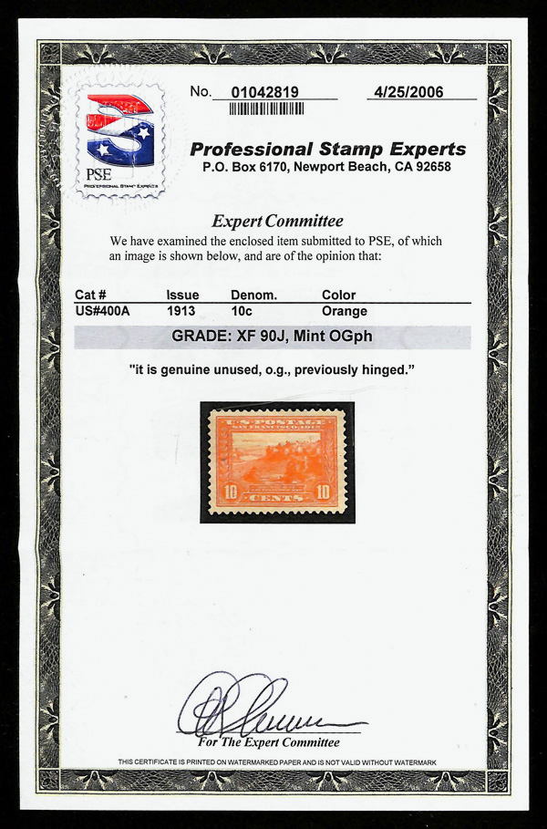 5160 og 400A image1913, 10¢ Panama-Pacific, perf. 12, orange (Scott 400A), o.g., lightly hinged, jumbo margins, Extremely Fine, with 2006 P.S.E. certificate graded XF 90J & 1984 P.F. certificate.