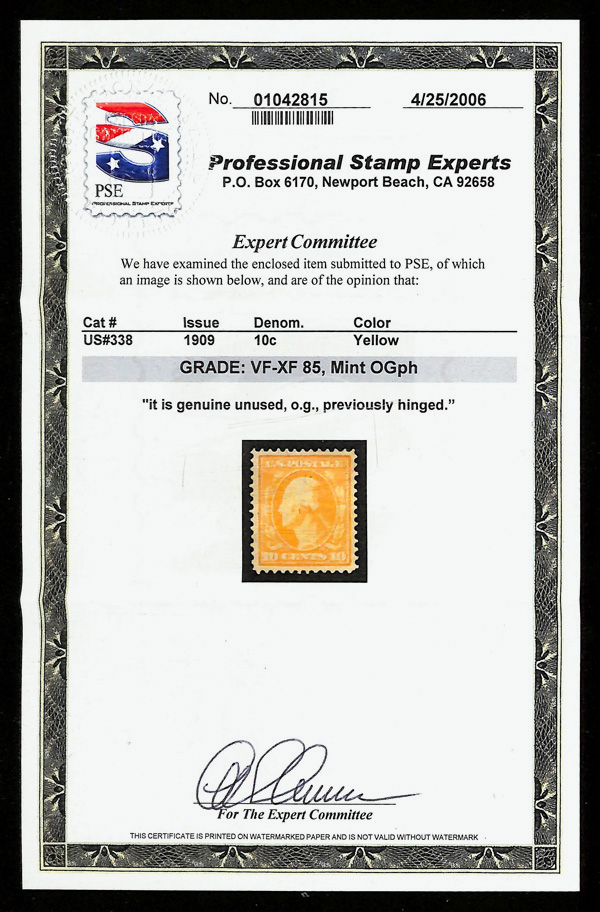 5130 og 338 image1909, 10¢ yellow, D.L. watermark (Scott 338), o.g., lightly hinged, Very Fine to Extremely Fine, with 2006 P.S.E. certificate graded VF-XF 85.