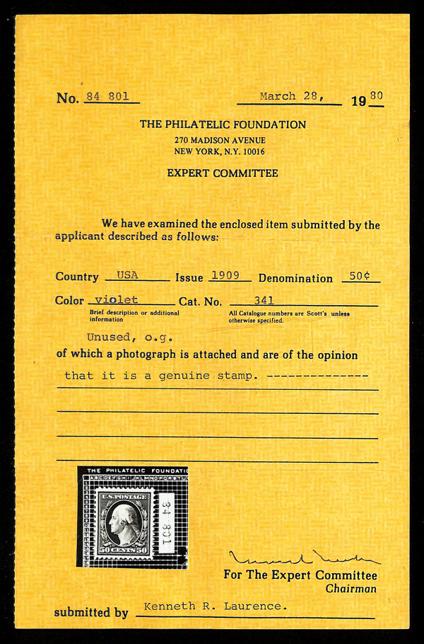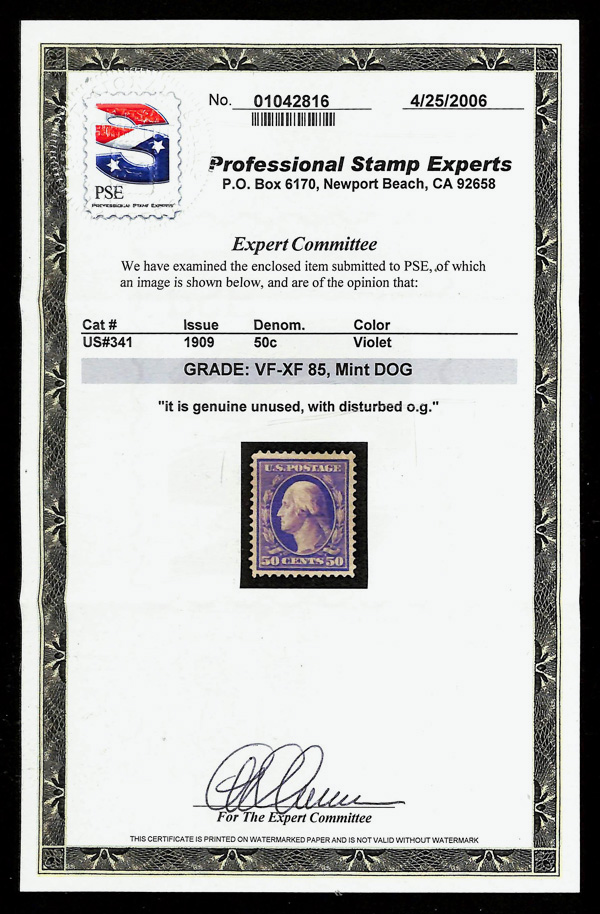 5133 og 341 image1909, 50¢ violet, D.L. watermark (Scott 341), disturbed o.g., Very Fine to Extremely Fine, with 2006 P.S.E. certificate graded VF-XF 85 & 1980 P.F. certificate.