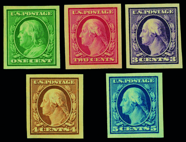 5134 nh 343-347 image1908, Washington-Franklins, D.L. watermark, imperf., 1¢ to 5¢ complete (Scott 343-347), o.g., never hinged, Very Fine to Extremely Fine.