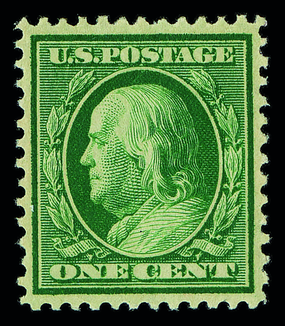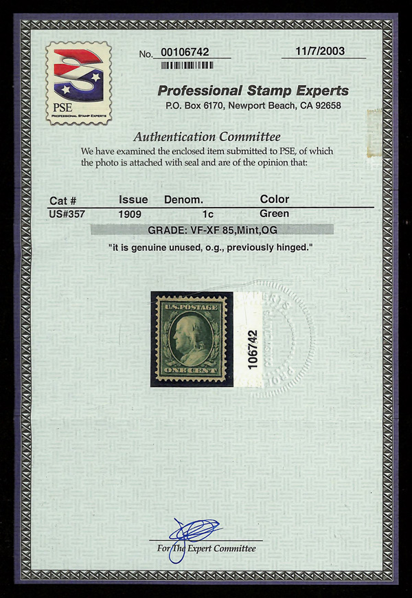 5135 og 357 image1909, 1¢ green, on bluish paper (Scott 357), o.g., lightly hinged, Very Fine to Extremely Fine, with 2003 P.S.E. certificate graded VF-XF 85.