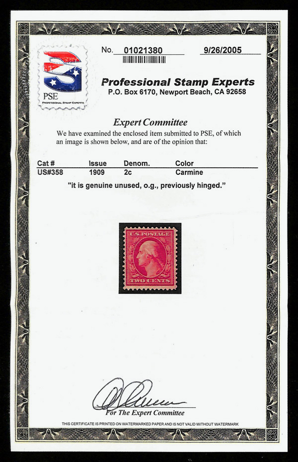 5136 og 358 image1909, 2¢ carmine, on bluish paper (Scott 358), o.g., lightly hinged, Fine to Very Fine, with 2005 P.S.E. certificate.