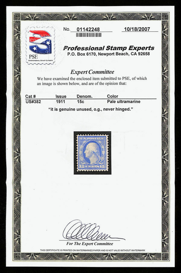 5151 nh 382 image1911, 15¢ pale ultramarine, S.L. watermark (Scott 382), o.g., never hinged, Fine to Very Fine, with 2007 P.S.E. certificate.