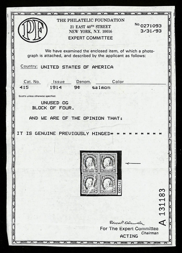 5170 og 415 image1914, 9¢ salmon red, S.L. watermark, perf. 12 (Scott 415), o.g., very lightly hinged, Very Fine to Extremely Fine, with photocopy of 1993 P.F. certificate for block of which this is the UR stamp.