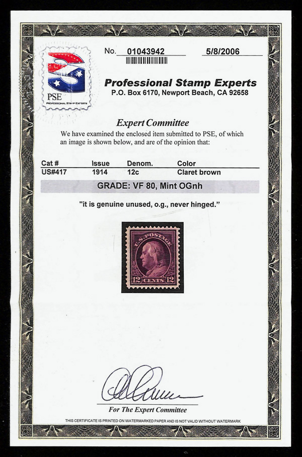 5172 nh 417 image1914, 12¢ claret brown, S.L. watermark, perf. 12 (Scott 417), o.g., never hinged, Very Fine, with 2006 P.S.E. certificate graded VF 80.