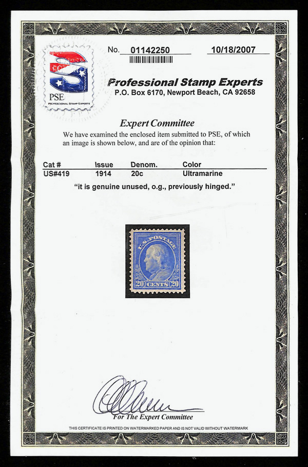 5173 og 419 image1914, 20¢ ultramarine, S.L. watermark, perf. 12 (Scott 419), o.g., hinged, Very Fine, with 2007 P.S.E. certificate & 1979 P.F. certificate.