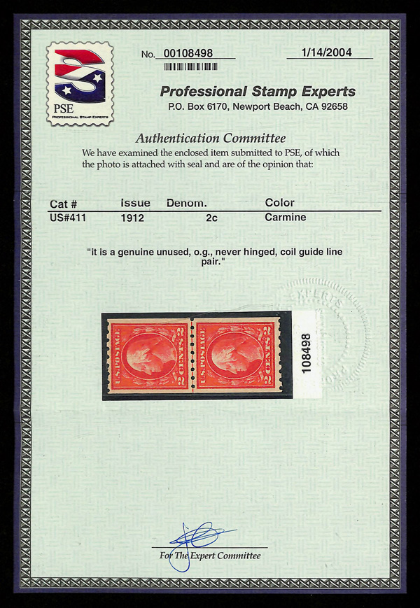 5166 nh 411 image1912, 2¢ carmine, type I, S.L. watermark, vertical coil, perf. 12 horizontally (Scott 411), guide line pair, o.g., never hinged, Very Fine, with 2004 P.S.E. certificate.