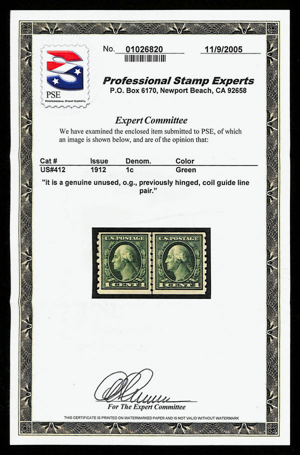 5167 og 412 image1912, 1¢ green, S.L. watermark, horizontal coil, perf. 12 vertically (Scott 412), guide line pair, o.g., lightly hinged, Fine to Very Fine, with 2005 P.S.E. certificate.