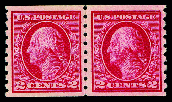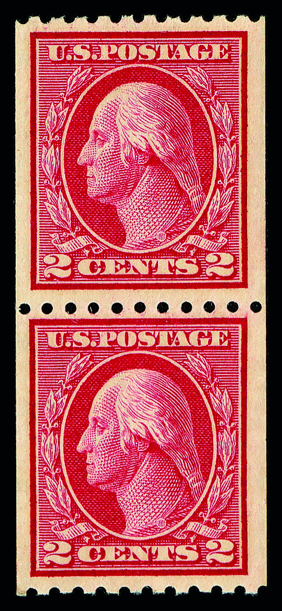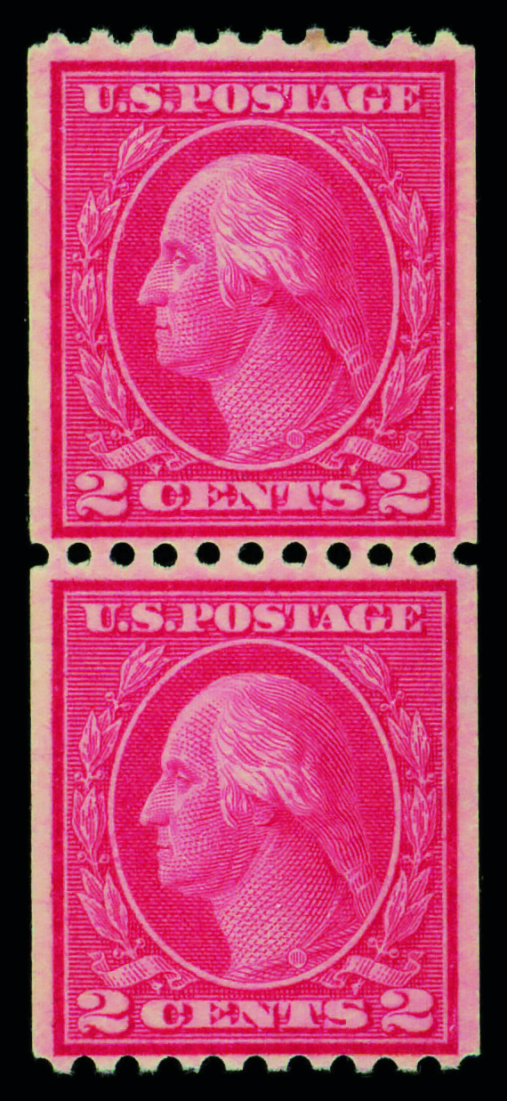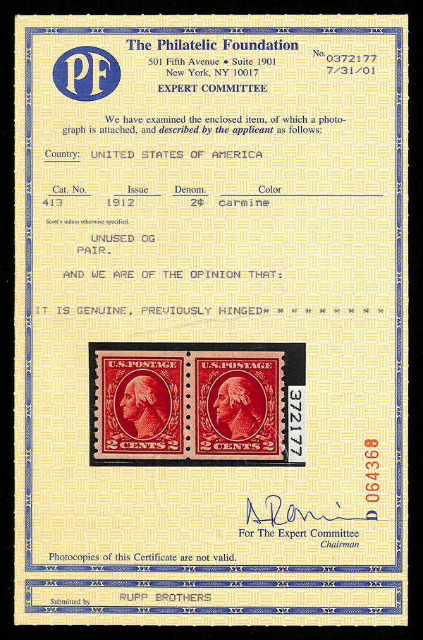 5168 og 413 image1912, 2¢ carmine, S.L. watermark, horizontal coil, perf. 12 vertically (Scott 413), pair, o.g., lightly hinged, Very Fine, with 2001 P.F. certificate.