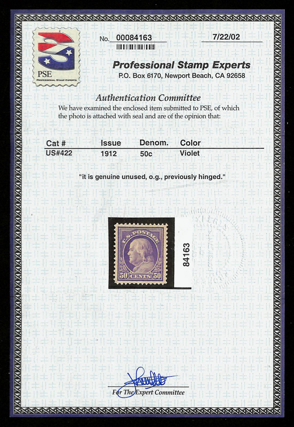 5174 og 422 image1912, 50¢ violet, D.L. watermark, perf. 12 (Scott 422), o.g., lightly hinged, Very Fine, with 2002 P.S.E. certificate.