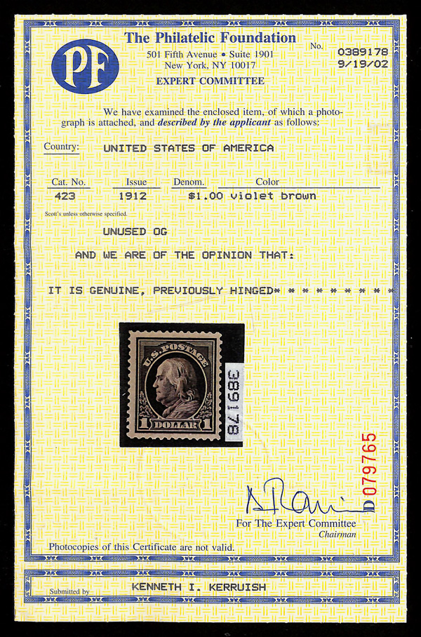 5175 og 423 image1912, $1 violet brown, D.L. watermark, perf. 12 (Scott 423), o.g., hinged, Very Fine, with 2002 P.F. certificate.