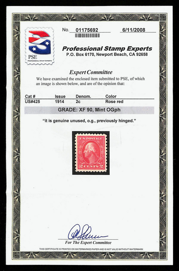 5176 og 425 image1914, 2¢ rose red, type I, S.L. watermark, perf. 10 (Scott 425), Extremely Fine, with 2008 P.S.E. certificate graded XF 90. (Image) (Image2) (All Images)
