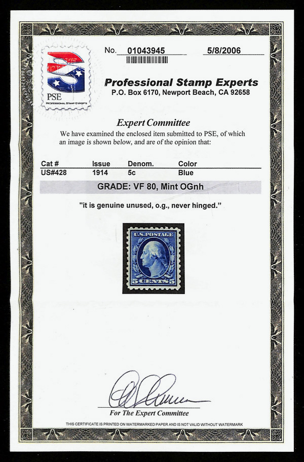 5177 nh 428 image1914, 5¢ blue, S.L. watermark, perf. 10 (Scott 428), o.g., never hinged, Very Fine, with 2006 P.S.E. certificate graded VF 80.