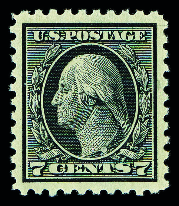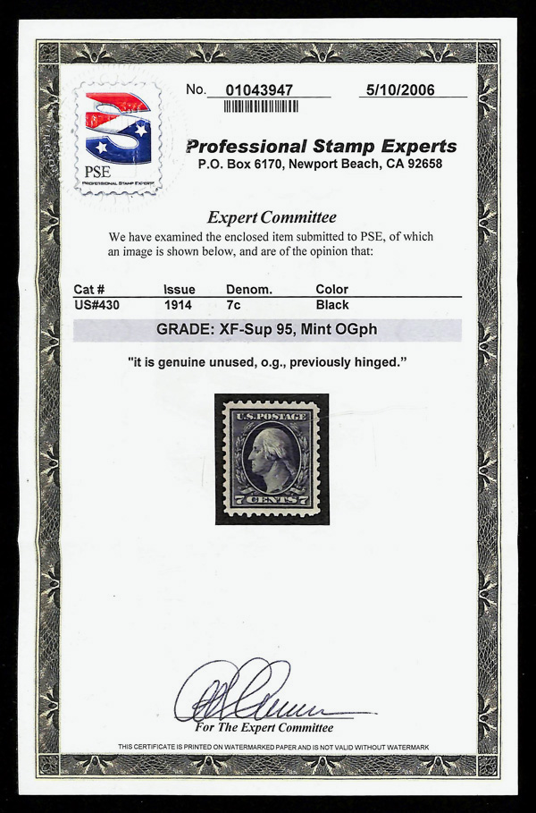 5179 og 430 image1914, 7¢ black, S.L. watermark, perf. 10 (Scott 430), o.g., very lightly hinged, Extremely Fine to Superb, with 2006 P.S.E. certificate graded XF-SUP 95.