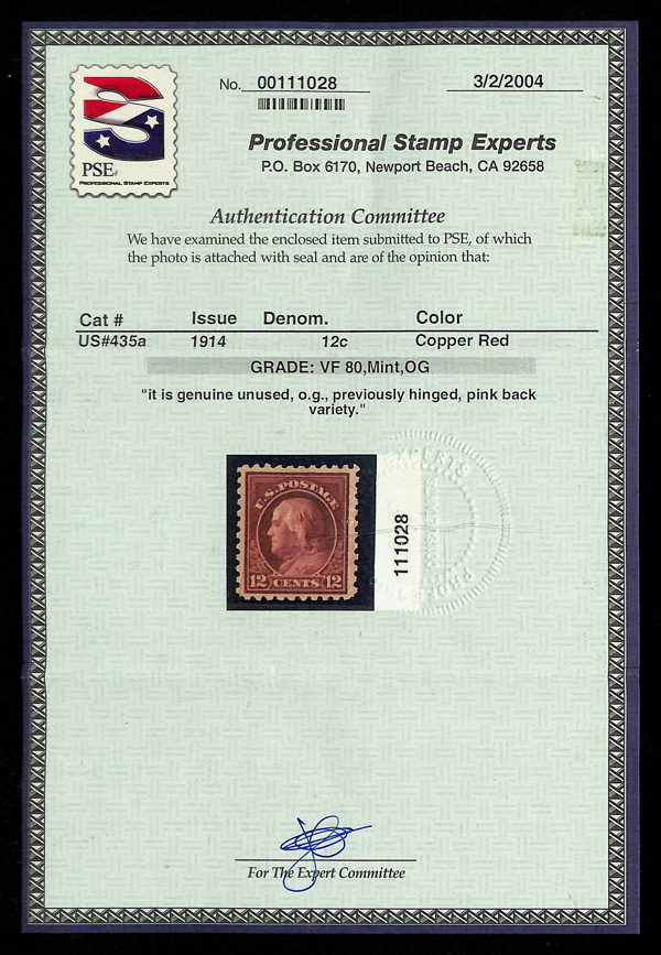 5184 og 435a image1914, 12¢ copper red, S.L. watermark, perf. 10 (Scott 435a), 'pink back' variety, o.g., very lightly hinged, Very Fine, with 2004 P.S.E. certificate graded VF 80.