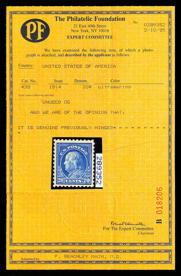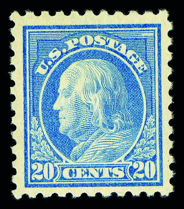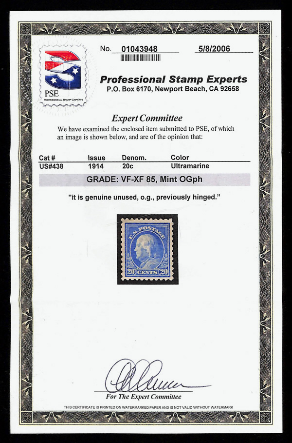 5186 og 438 image1914, 20¢ ultramarine, S.L. watermark, perf. 10 (Scott 438), o.g., very lightly hinged, Very Fine to Extremely Fine, with 2006 P.S.E. certificate graded VF-XF 85 & 1995 P.F. certificate.