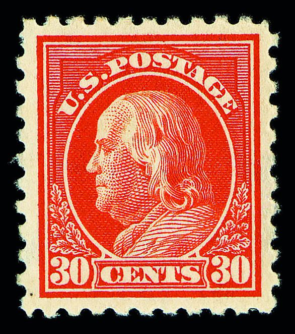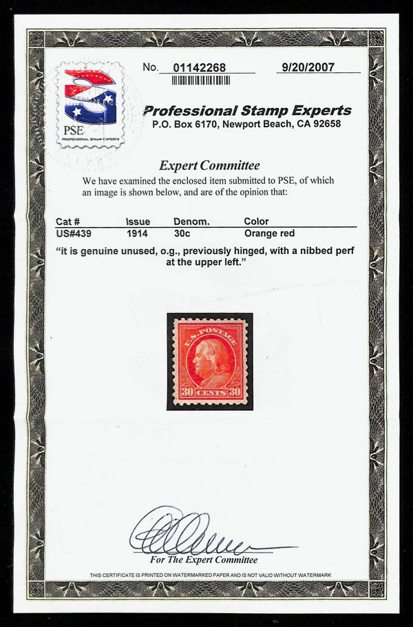 5187 og 439 image1914, 30¢ orange red, S.L. watermark, perf. 10 (Scott 439), o.g., hinged; short perf UL, Very Fine to Extremely Fine, with 2007 P.S.E. certificate.