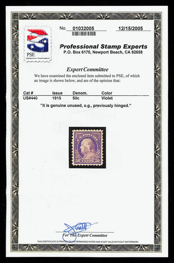 5188 og 440 image1915, 50¢ violet, S.L. watermark, perf. 10 (Scott 440), o.g., hinged, Very Fine, with 2005 P.S.E. certificate.