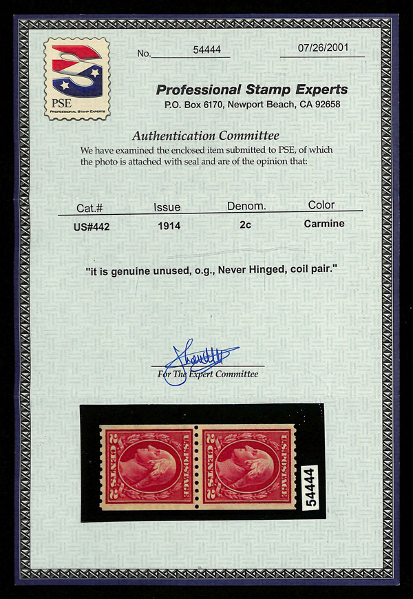 5190 nh 442 image1914, 2¢ carmine, type I, S.L. watermark, flat plate coil, perf. 10 horizontally (Scott 442), pair, o.g., never hinged, Fine to Very Fine, with 2001 P.S.E. certificate.