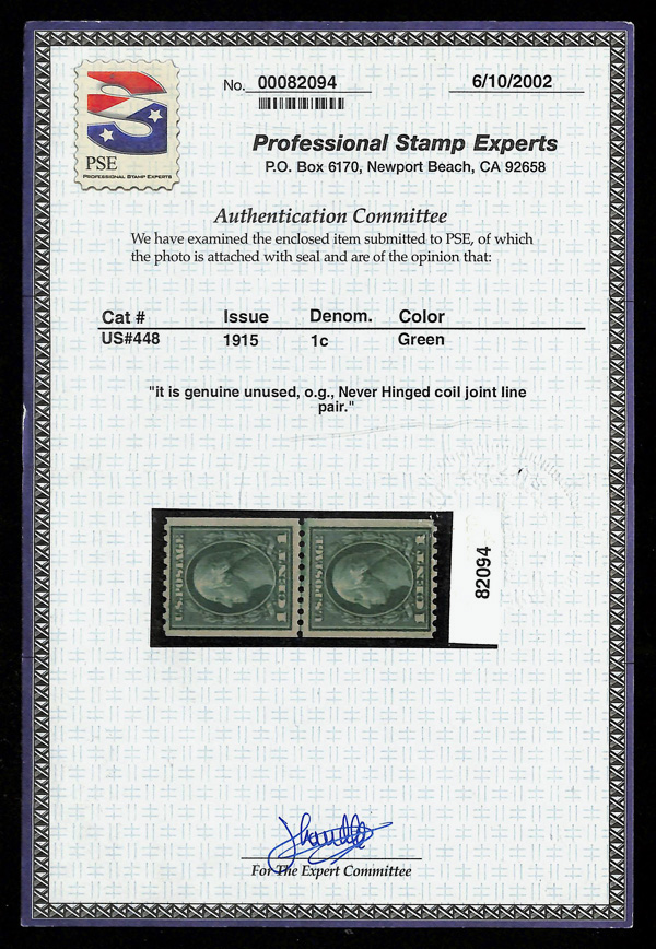 5191 nh 448 image1915, 1¢ green, S.L. watermark, rotary press coil, perf. 10 horizontally (Scott 448), joint line pair, o.g., never hinged, Fine to Very Fine, with 2002 P.S.E. certificate.