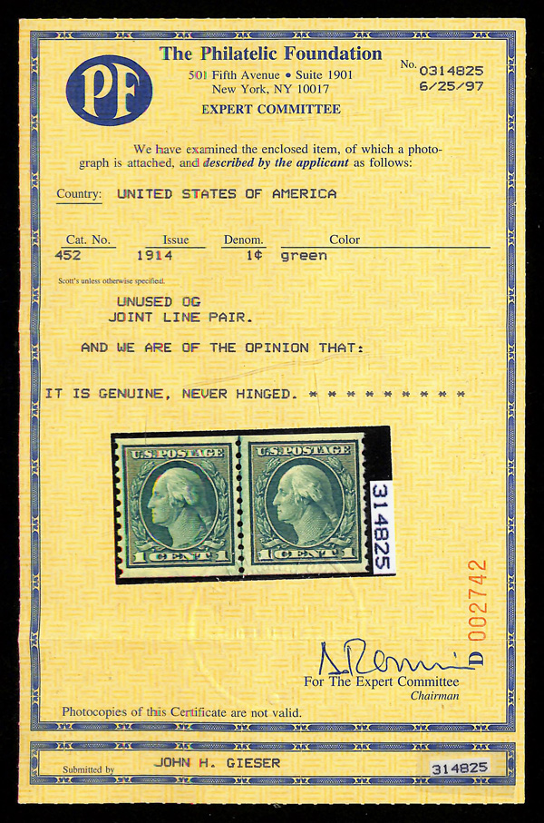 5193 nh 452 image1914, 1¢ green, S.L. watermark, rotary press coil, perf. 10 vertically (Scott 452), joint line pair, o.g., never hinged, Fine to Very Fine, with 2025 P.F. certificate.