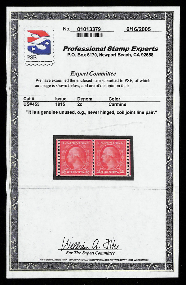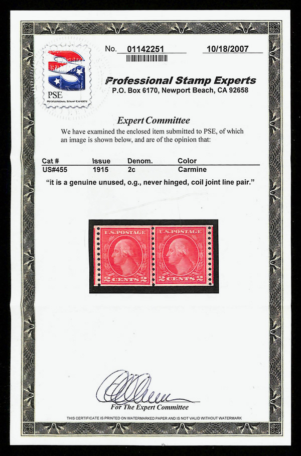 5194 nh 455 image1915, 2¢ carmine, type III, S.L. watermark, rotary press coil, perf. 10 vertically (Scott 455), joint line pair, o.g., never hinged, Fine to Very Fine, with 2007 P.S.E. certificate & photocopy of P.S.E. 2005 certificate.