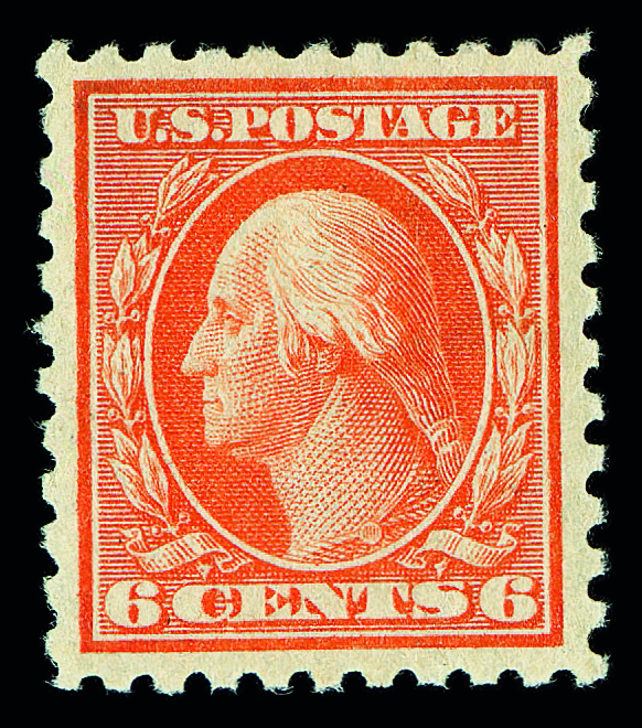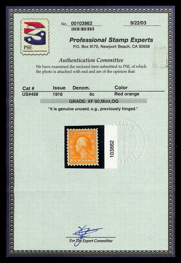 5198 og 468 image1916, 6¢ red orange, unwatermarked, perf. 10 (Scott 468), o.g., lightly hinged, Extremely Fine, with 2003 P.S.E. certificate graded XF 90.