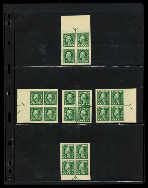 5164 nhbl 408 image1912, 1¢ green, S.L. watermark, imperf. (Scott 408), arrow and centerline blocks of 4, o.g., never hinged, Extremely Fine.