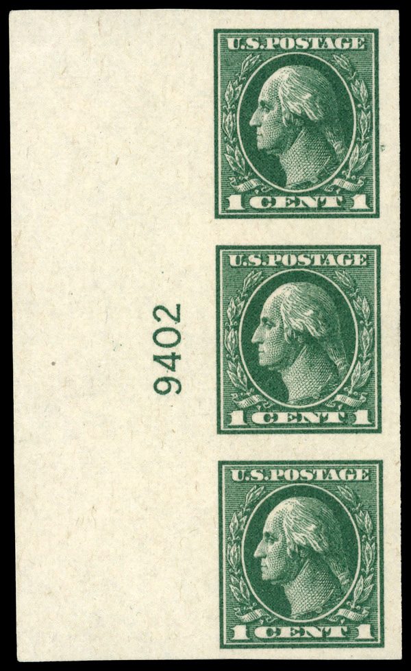 5230 nh 531 image1919, 1¢ green, offset printing, imperf. (Scott 531), strip of 3 with plate number, o.g., never hinged, Extremely Fine.