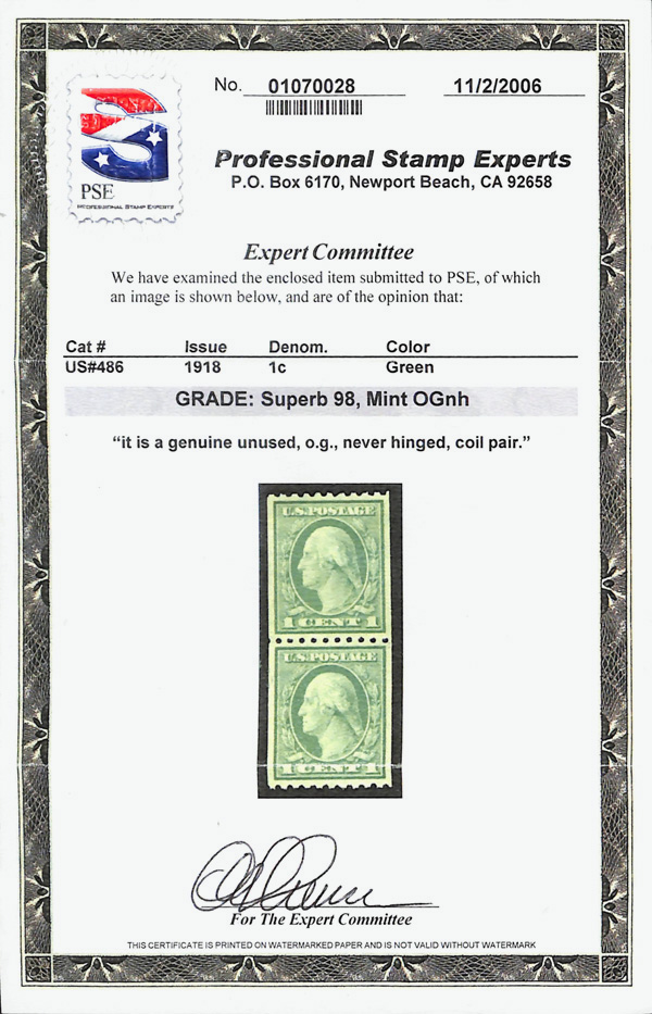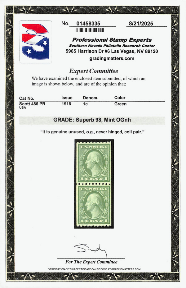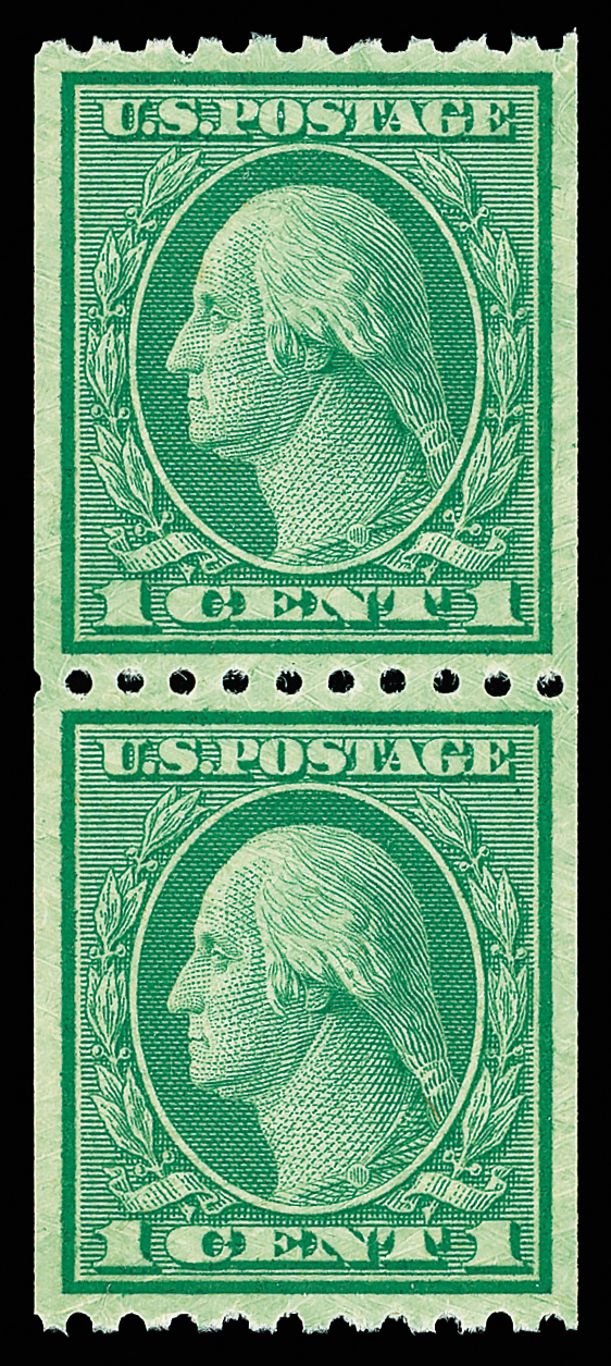 5209 nh 486 image1918, 1¢ green, unwatermarked, rotary press coil, perf. 10 horizontally (Scott 486), pair, wonderfully preserved fresh hue, o.g., never hinged, Superb, with 2025 P.S.E. certificate graded SUP 98.