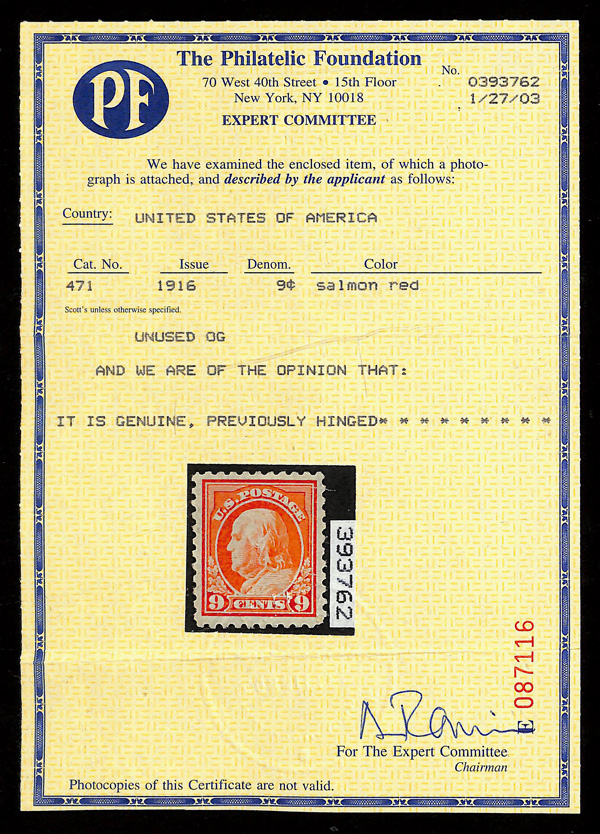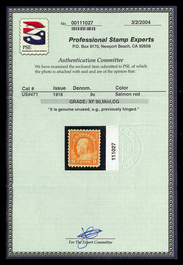 5201 og 471 image1916, 9¢ salmon red, unwatermarked, perf. 10 (Scott 471), o.g., very lightly hinged, Extremely Fine, with 2004 P.S.E. certificate graded XF 90 & 2003 P.F. certificate.