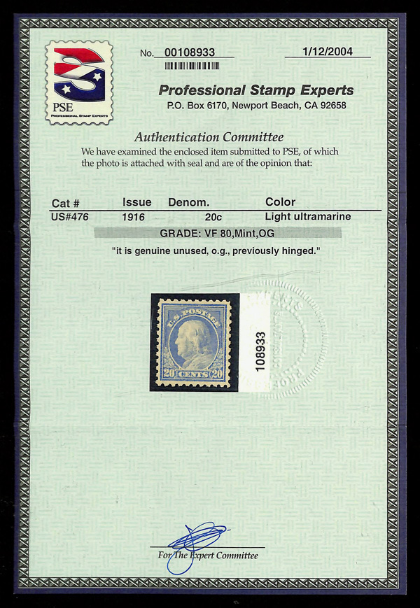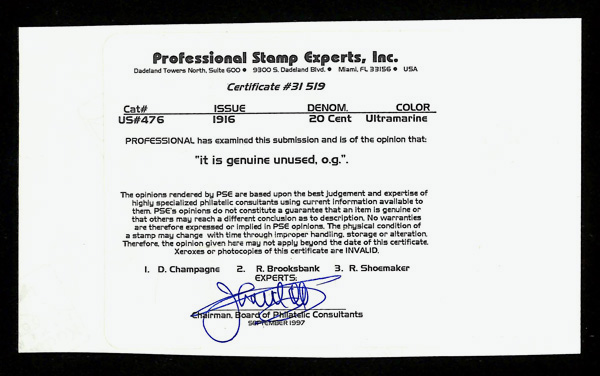 5206 og 476 image1916, 20¢ light ultramarine, unwatermarked, perf. 10 (Scott 476), o.g., lightly hinged, Very Fine, with 2004 P.S.E. certificate graded VF 80 & 1997 P.S.E. photo certificate.