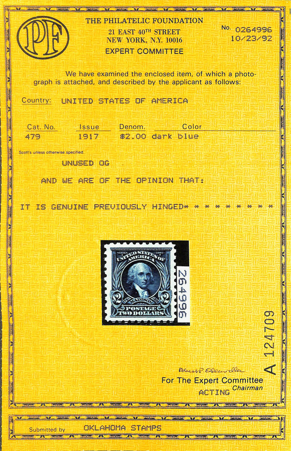 5207 og 479 image1917, $2 dark blue, perf. 10 (Scott 479), o.g., lightly hinged, Very Fine to Extremely Fine, with 1992 P.F. certificate.