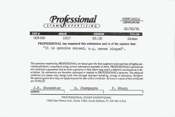 5208 nh 480 image1917, $5 light green, perf. 10 (Scott 480), o.g., never hinged, Very Fine, with 1991 P.S.E. photo certificate.