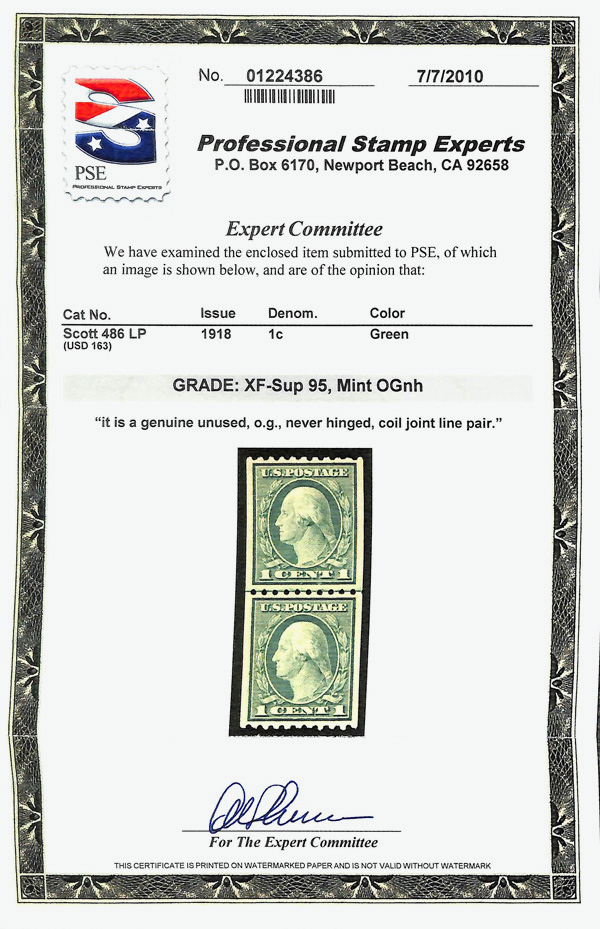 5210 nh 486 image1918, 1¢ green, unwatermarked, rotary press coil, perf. 10 horizontally (Scott 486), joint line pair, o.g., never hinged, Extremely Fine to Superb, with 2010 P.S.E. certificate graded XF-SUP 95.